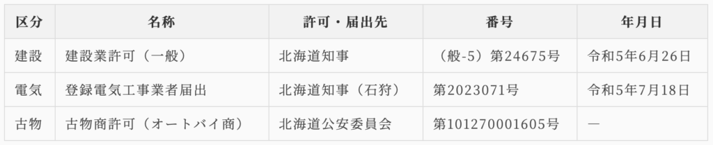 | 建設 | 建設業許可(一般) | 北海道知事 | (般-5)第24675号 | 令和5年6月26日 |
